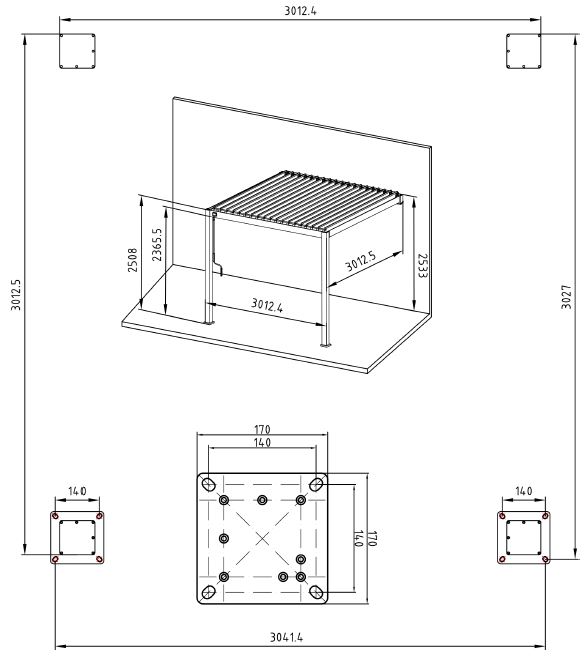 Die Überdachung wird mit Spreizbolzen zur Befestigung am Boden geliefert. Der Mirador muss auf einer soliden und festen Unterlage montiert werden, zum Beispiel durch ein Betonfundament (oder große, schwere Terrassenplatten). Vergewissern Sie sich, dass der Belag rechtwinklig und eben verlegt ist.